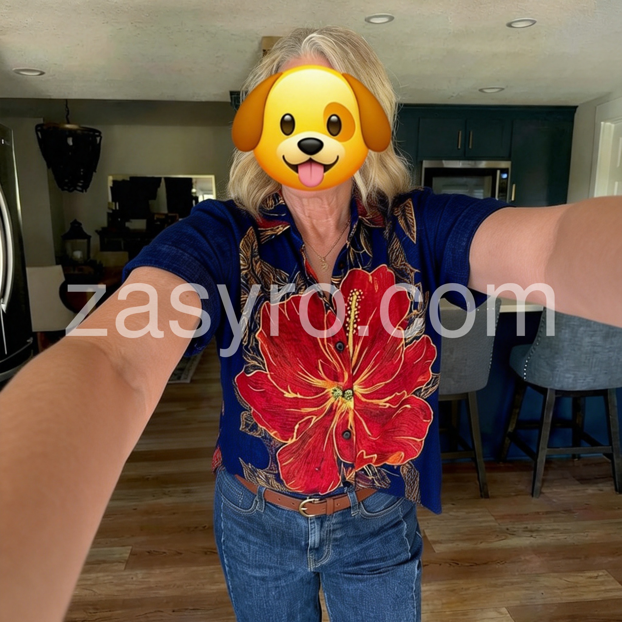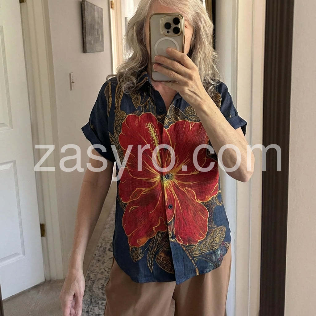 Channel island vibes with this Bold Tropical Hibiscus Print Top, a vibrant statement piece that brings the essence of paradise to your wardrobe. Crafted from lightweight, breathable fabric—likely cotton or linen blend—it features a rich navy base adorned with a striking oversized red hibiscus flower outlined in golden yellow, complemented by intricate leafy patterns throughout. The classic short-sleeve shirt design includes a relaxed fit, button-down front, and rolled sleeves for an effortless, laid-back look. Perfect for pairing with denim jeans, high-waisted shorts, or flowy skirts, this top is ideal for beach days, tropical getaways, or summer city strolls. Its bold floral motif exudes bohemian charm and exotic flair, making it a standout choice for those who love fashion with personality. Inspired by the playful, romantic styles found on sites like Lulus, this shirt effortlessly blends artistry and comfort—ideal for adding a splash of color and confidence to your warm-weather wardrobe.