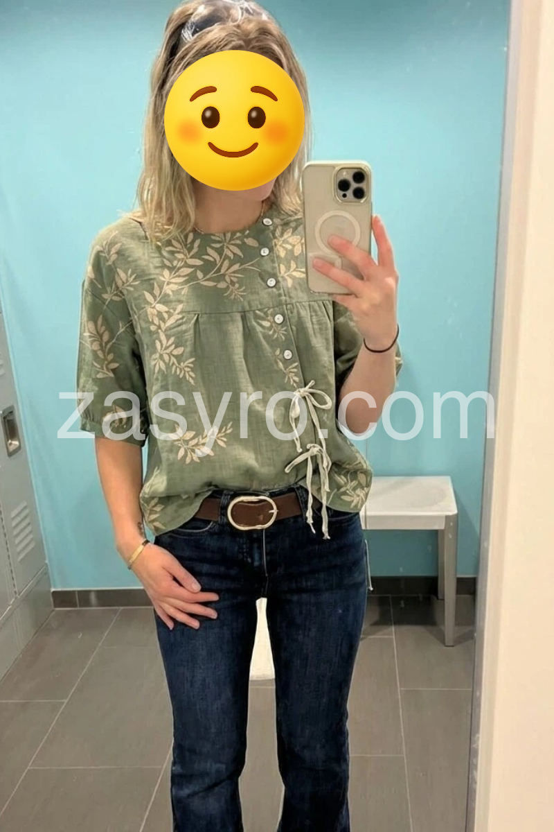 This loose-fit top features a soft olive green base with delicate leaf patterns. Front button-down design and side ties add a stylish touch. Short sleeves with rolled cuffs for comfort. Lightweight fabric perfect for casual wear. Effortlessly chic with a boho-vibe.