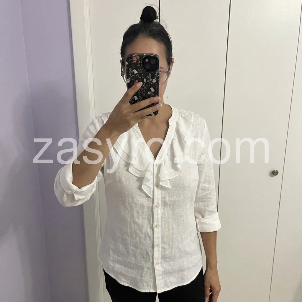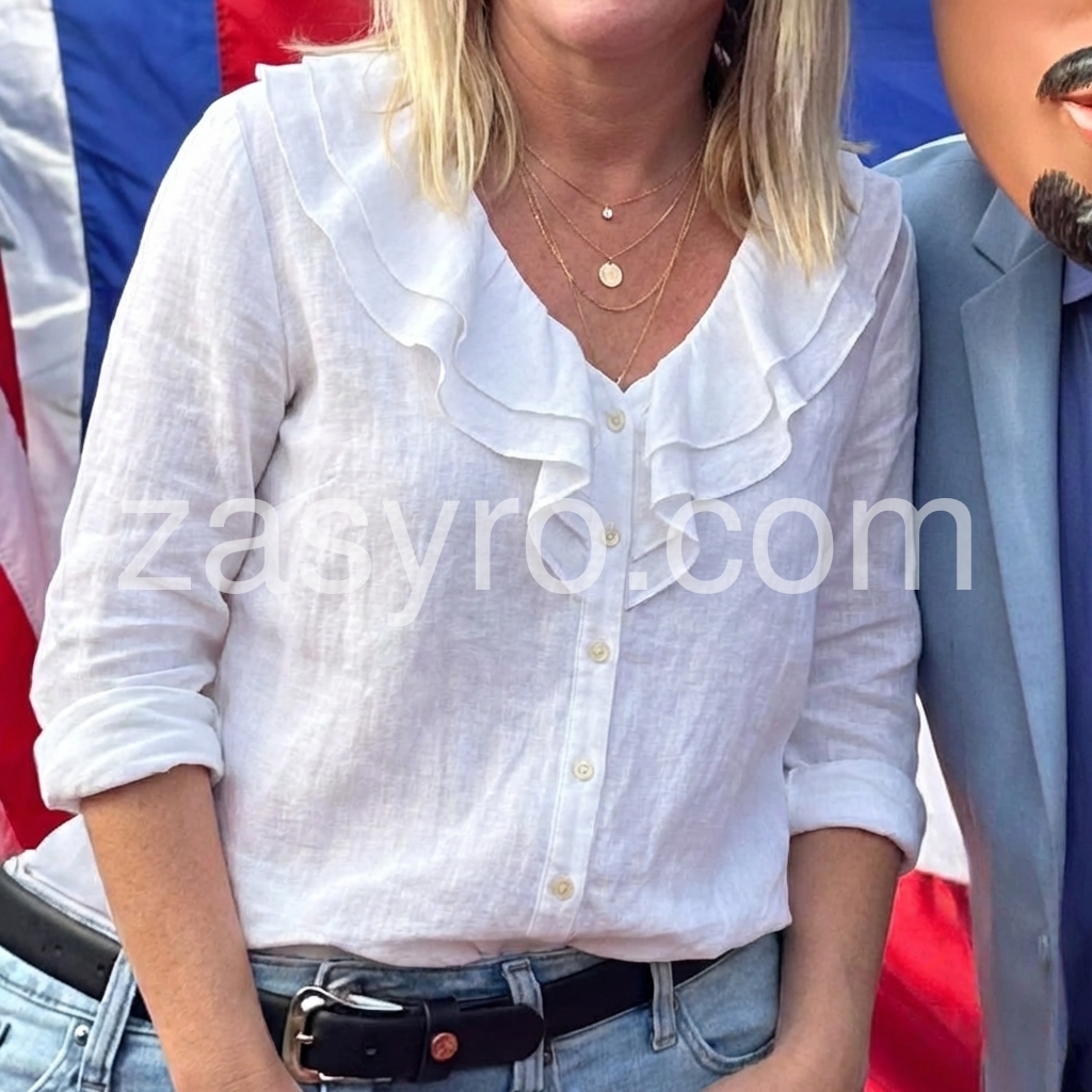 White Ruffle V-Neck Linen Blouse