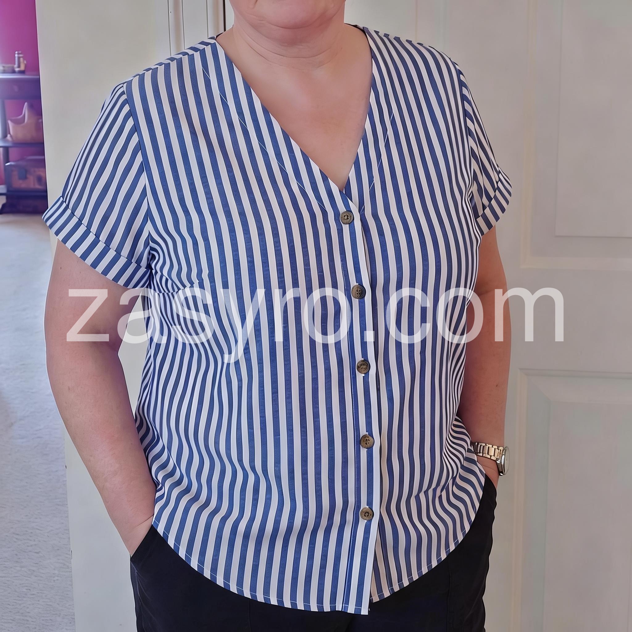 This V-neck top features vertical blue and white stripes with a front button closure. Rolled short sleeves add a relaxed, breezy touch. Lightweight fabric perfect for warm days. Pair with jeans or shorts for a timeless look. Effortlessly chic and easy to style.