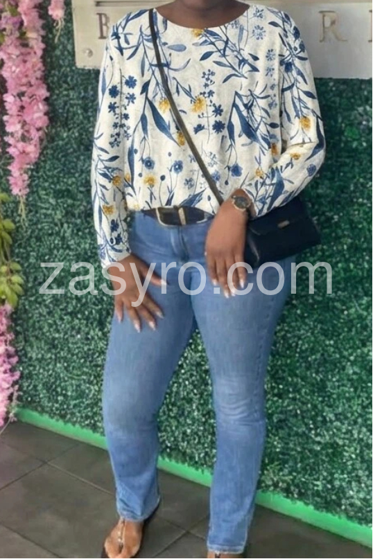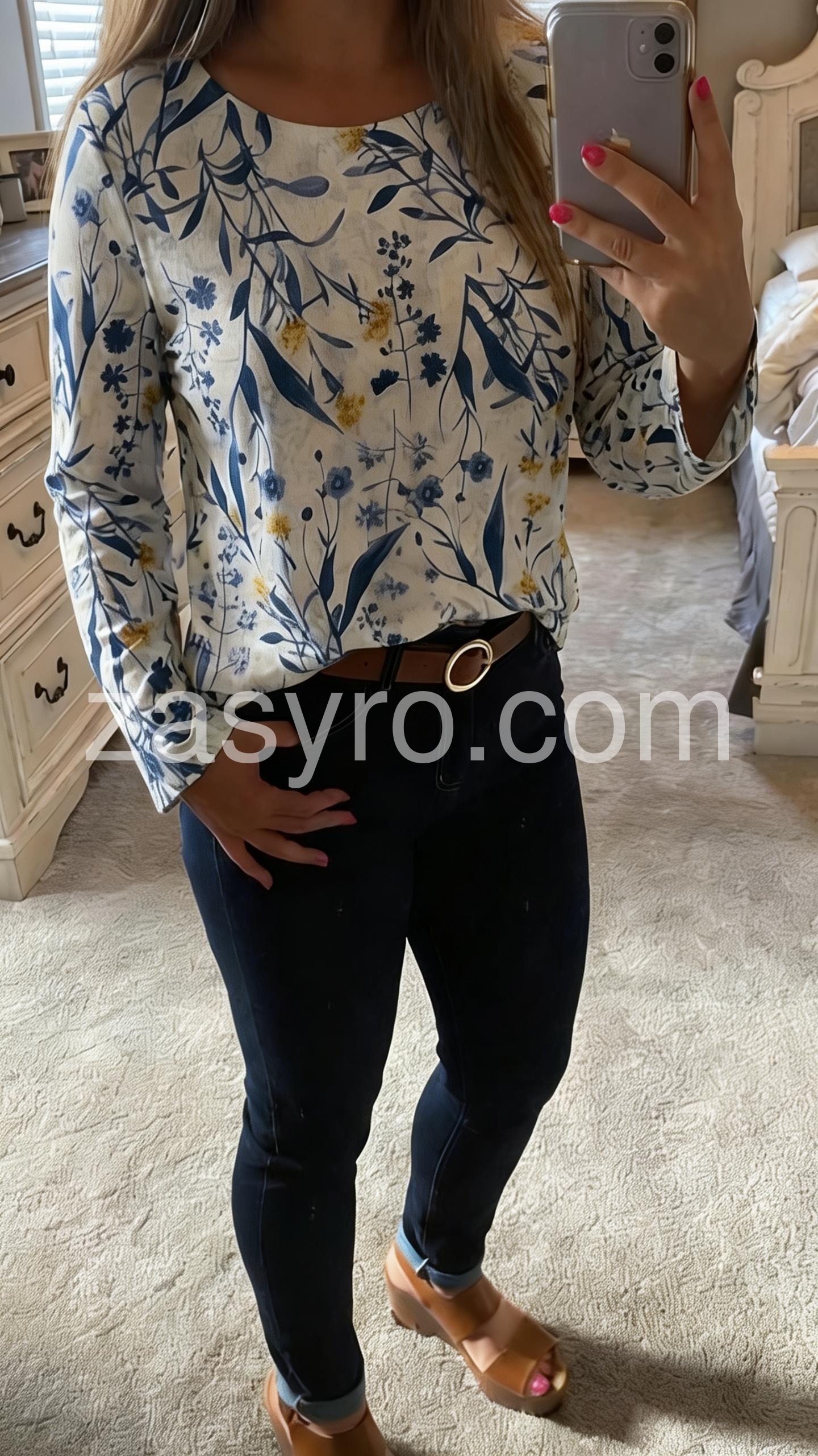 This loose-fit top features a delicate blue and yellow floral print on a soft white base. Long sleeves with a relaxed, batwing silhouette. Round neckline and asymmetrical hem for effortless style. Lightweight fabric perfect for casual days. Ideal for pairing with jeans or leggings.