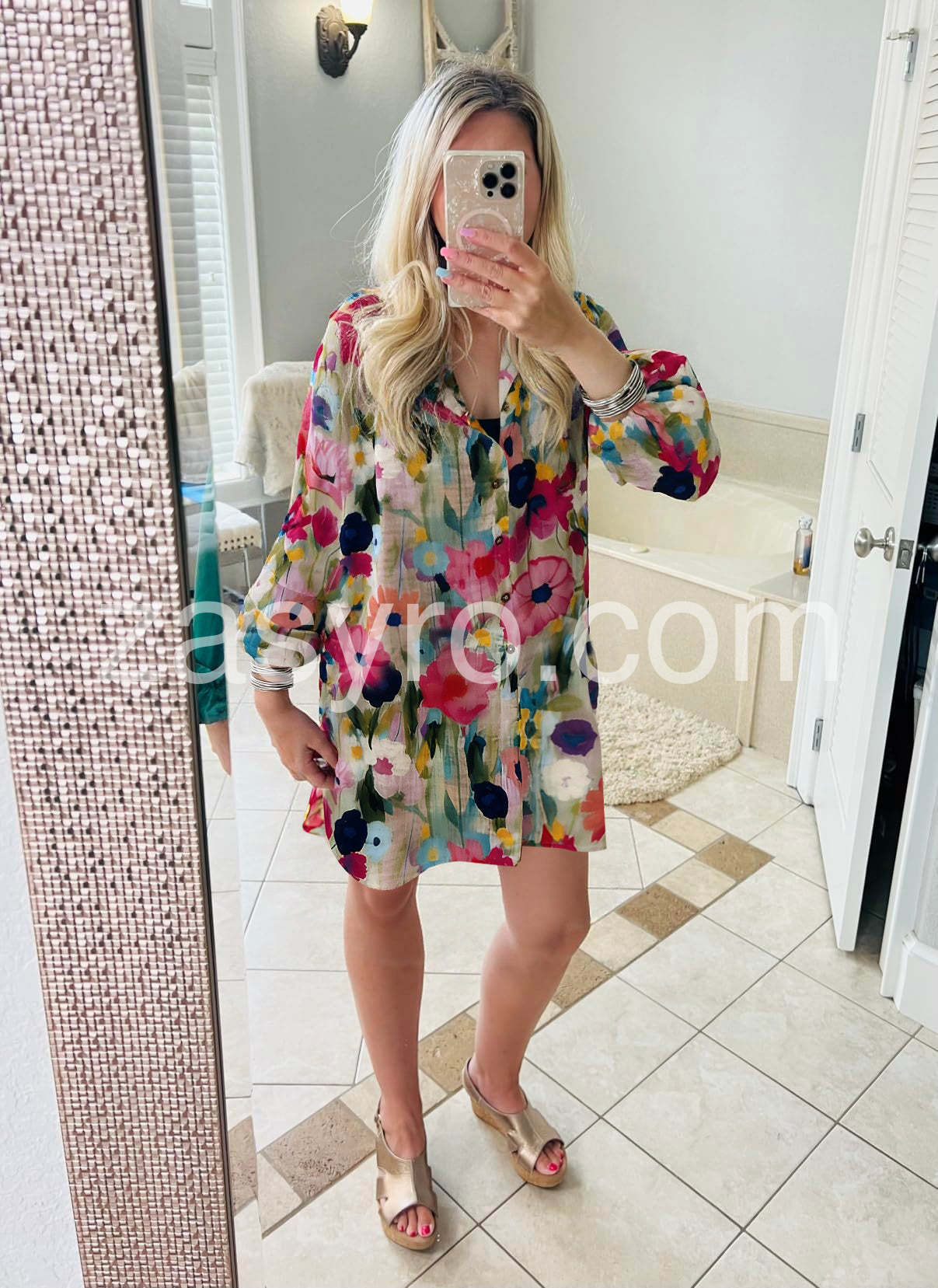 Embrace effortless style with this Bold Floral Print Shirt Mini Dress, a vibrant and versatile piece that turns heads with its lively, painterly design. Crafted from lightweight, breathable fabric—likely cotton or linen blend—this oversized dress features a dynamic watercolor-inspired floral pattern in rich shades of fuchsia, navy blue, coral, white, and soft green, creating a joyful burst of color against a neutral base. The classic shirt silhouette includes a collared neckline, front button closure, and long sleeves that can be rolled up for a relaxed, laid-back look. Its loose, flowing fit drapes beautifully, offering comfort and movement while exuding boho-chic charm. Perfect for casual outings, beach days, or weekend strolls, it pairs effortlessly with sandals, sunglasses, and a crossbody bag. Styled here with layered bracelets and minimalist jewelry, it balances bold print with understated elegance. Let this floral shirt dress become your go-to choice for summer fashion that’s both expressive and easygoing.
