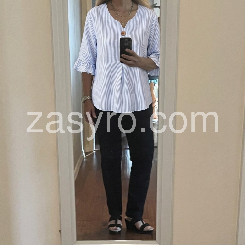 As a designer, I crafted this blouse to solve the common pain point of "too casual or too formal" daily tops. The notched V-neck flatters all necklines, while the ruffled cuffs add a feminine touch without being overly frilly.