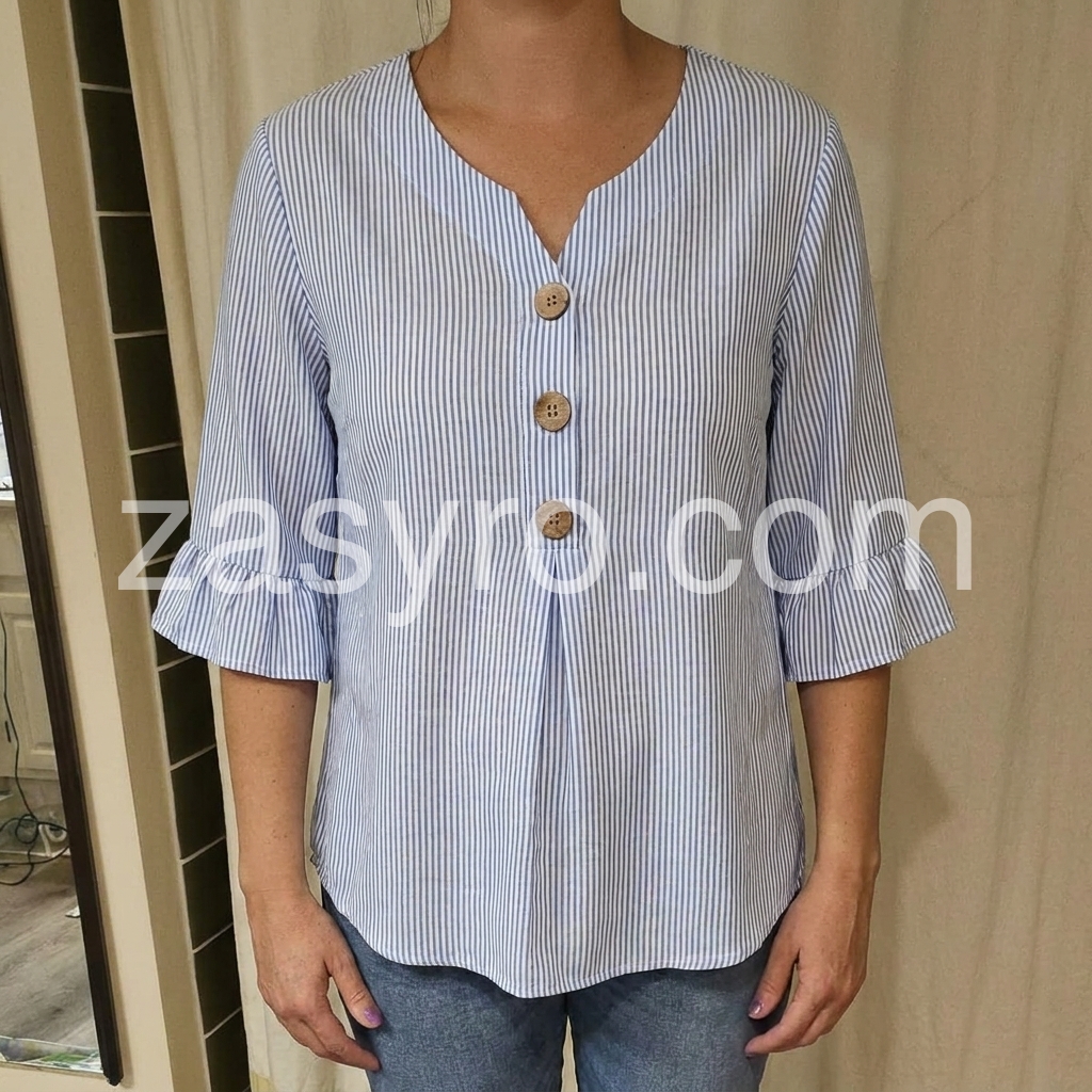 Blue Stripe Ruffle Sleeve V-Neck Blouse