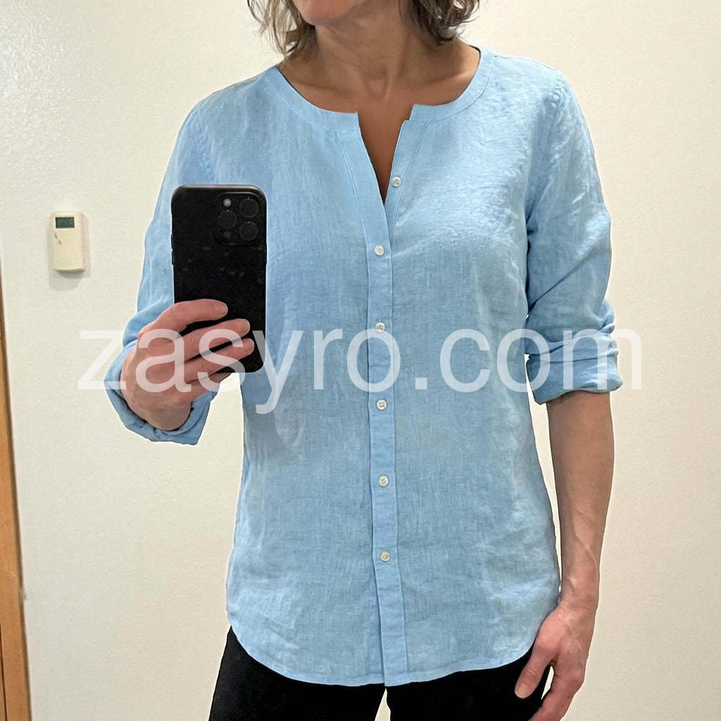 Elevate your everyday style with this Soft Blue Linen-Blend Button Up Blouse, a breath of fresh air for warm-weather wardrobes. Crafted from lightweight, breathable fabric with a subtle linen texture, this blouse offers a relaxed yet polished silhouette that’s perfect for both casual and semi-formal settings. Featuring a clean V-neckline with a split front detail, it adds a touch of modern elegance, while the full-length sleeves can be rolled up for a laid-back, effortless look. The soft sky-blue hue exudes calm sophistication, making it easy to pair with jeans, trousers, or skirts. Whether you're heading to the office, meeting friends for coffee, or enjoying a weekend stroll, this versatile top brings comfort and style in one. Inspired by the minimalist, curated fashion found on Lulus.com, it’s ideal for those who love timeless pieces with a hint of coastal charm. A wardrobe staple that combines simplicity, comfort, and understated beauty—perfect for women who appreciate effortless chic.