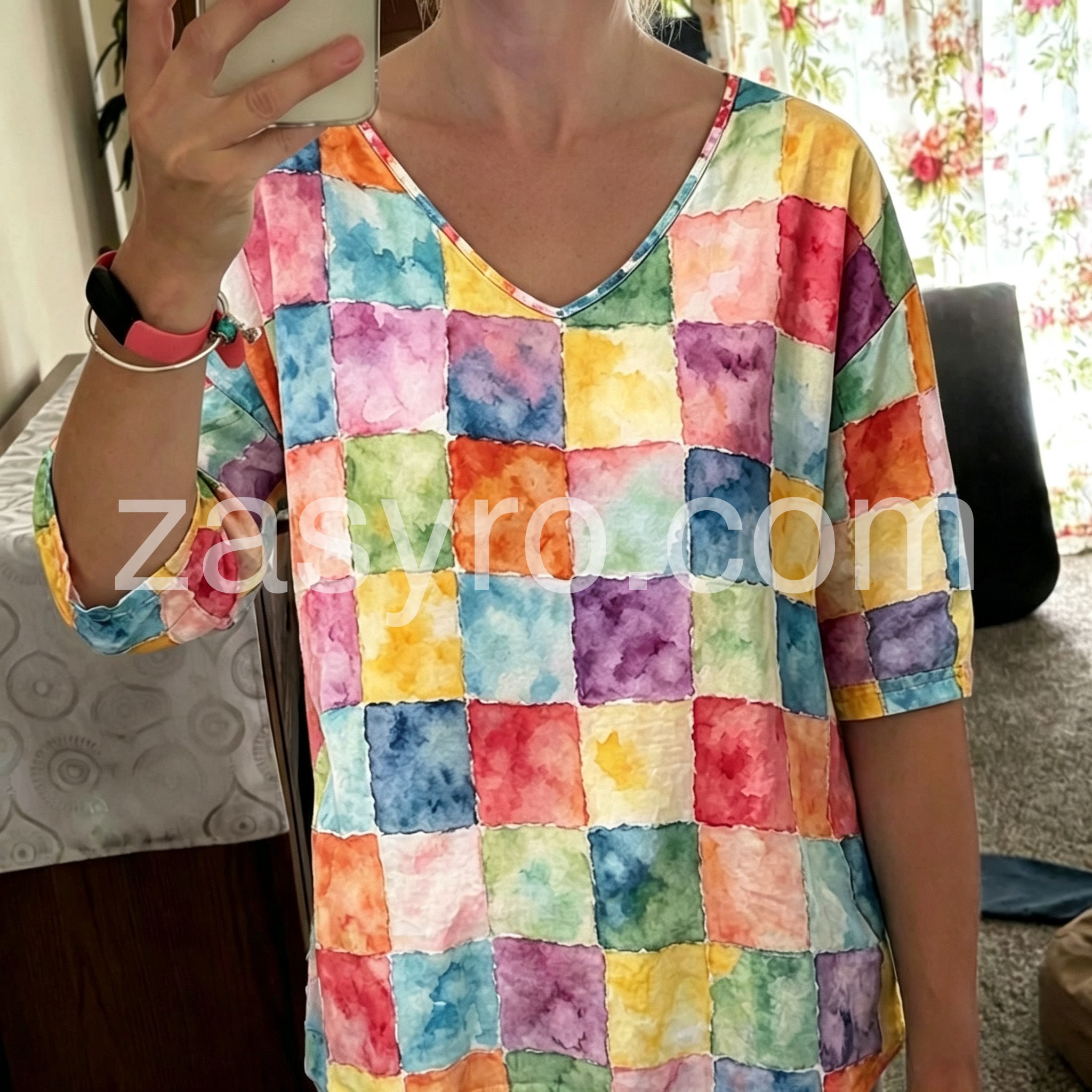 This blouse is designed to solve the "too boring or too flashy" top dilemma. The watercolor checkerboard print is vibrant yet soft, adding a pop of color without overwhelming your outfit.
