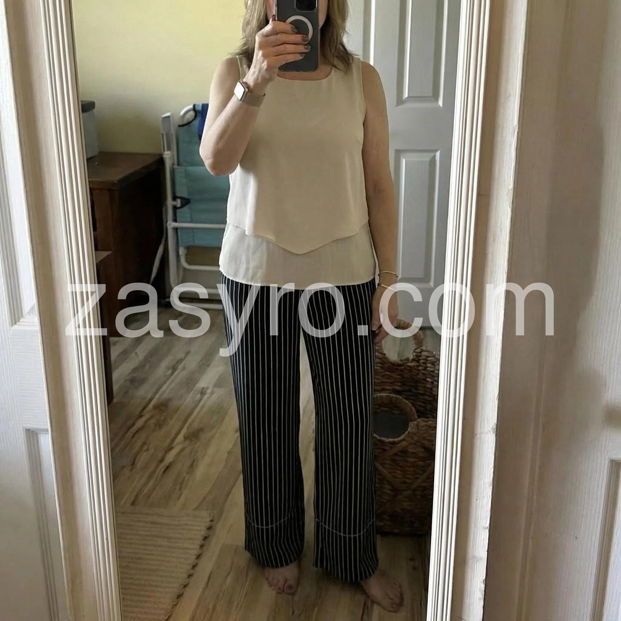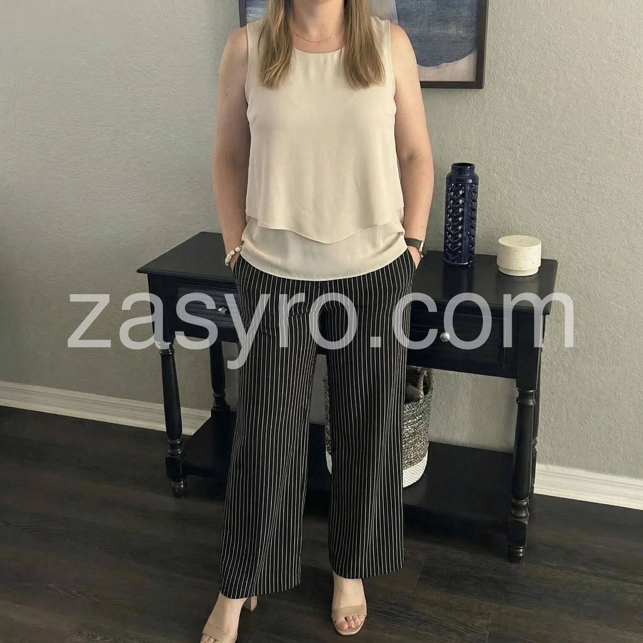 This two-piece set features a sleeveless beige top with a layered hem and square neckline. Paired with high-waisted black wide-leg pants in thin white stripes. Comfortable fit with a chic, relaxed silhouette. Perfect for casual outings or smart-casual events. Effortlessly stylish and easy to wear.