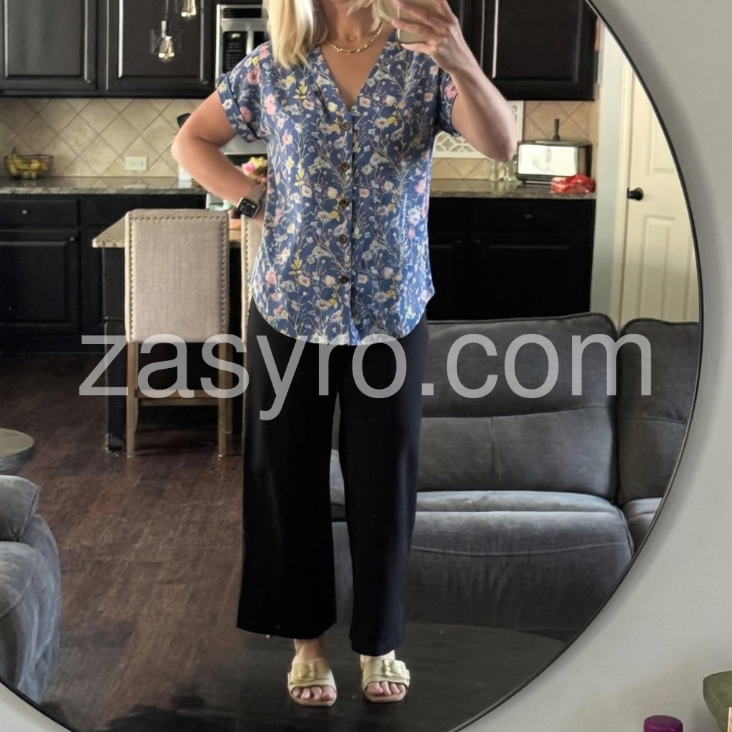 This short-sleeve V-neck blouse features a delicate floral print on a deep navy background. The button-down front adds a polished touch. Lightweight fabric perfect for warm weather. Pair with jeans or skirts for effortless style. Ideal for casual outings or spring days.