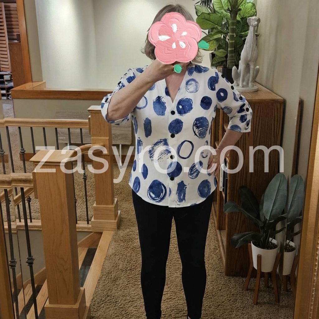 This V-neck blouse features a bold blue abstract dot print on a white background. Button-down front with three-quarter sleeves and button cuffs. Relaxed fit perfect for casual wear. Ideal for pairing with jeans or shorts. Modern and eye-catching design.