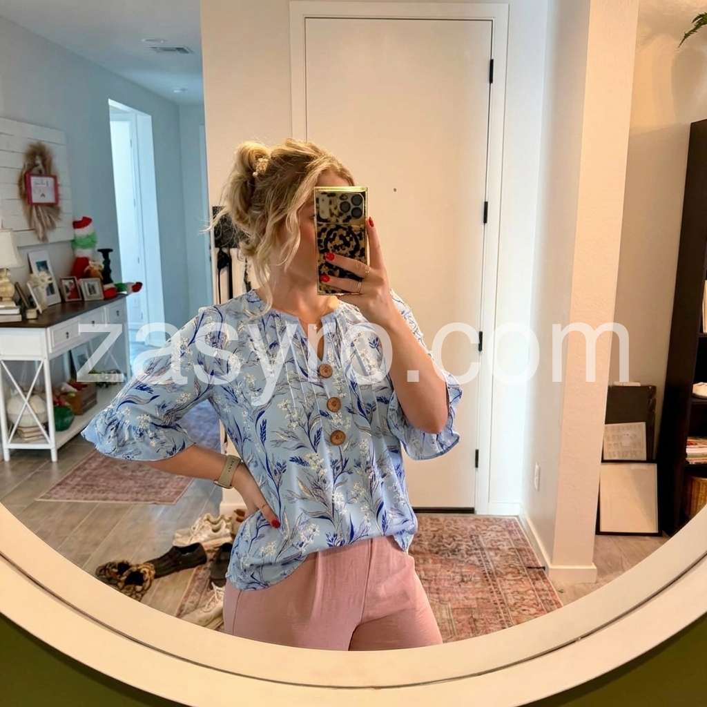 This blouse embodies effortless, feminine elegance. The soft sky-blue base, printed with delicate blue florals and foliage, feels endlessly romantic.