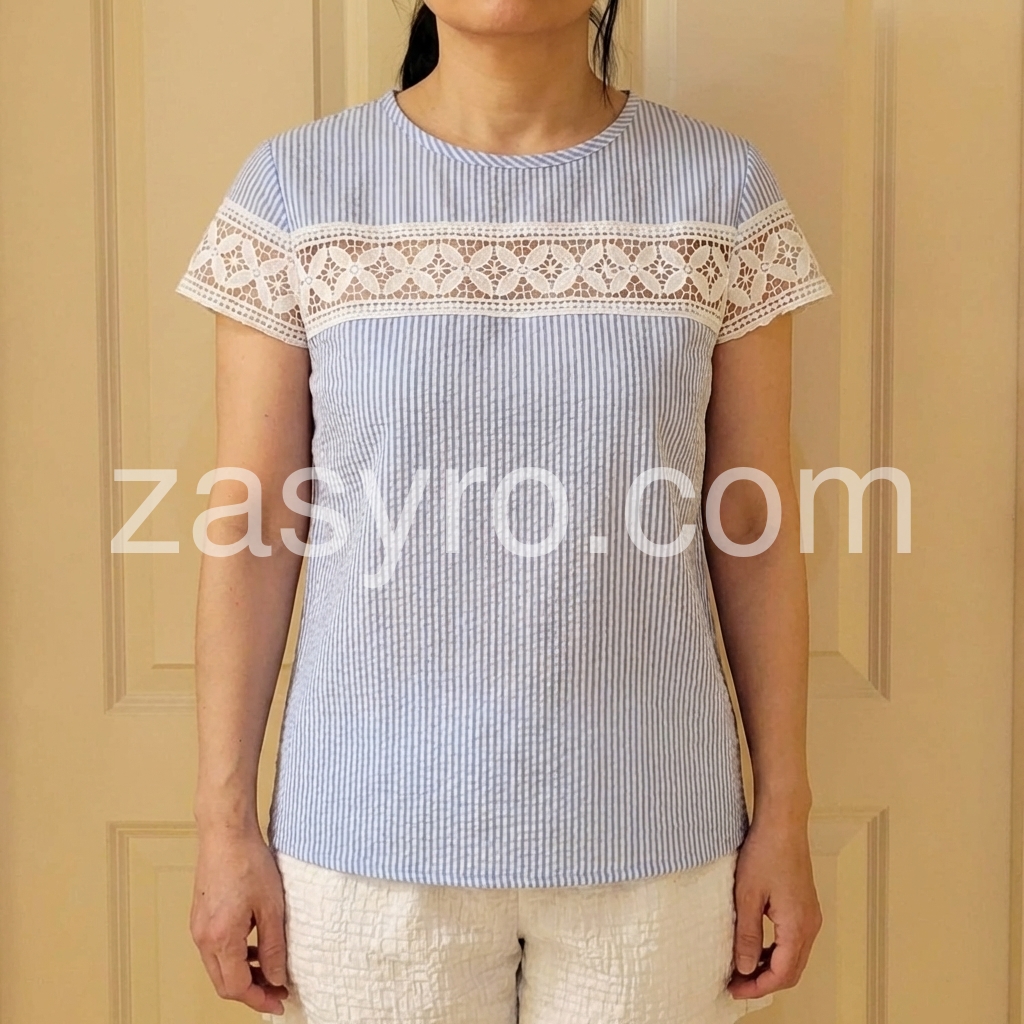 This short-sleeve top features a delicate white lace panel across the chest and sleeves. Made from soft, textured fabric with vertical stripes for a subtle pattern. Perfect for casual summer days or beach outings. Pair with shorts or jeans for a stylish look. Effortlessly chic and breathable.