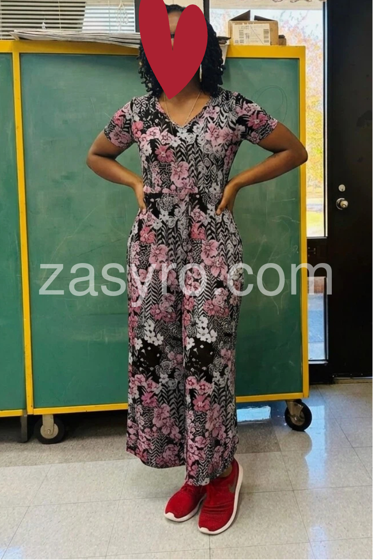 This V-neck jumpsuit features a bold floral pattern in soft pink and white on a black background. The short sleeves and wide-leg design offer a relaxed, stylish fit. Side pockets add practicality and ease. Lightweight fabric perfect for warm weather. Ideal for casual outings or summer days.
