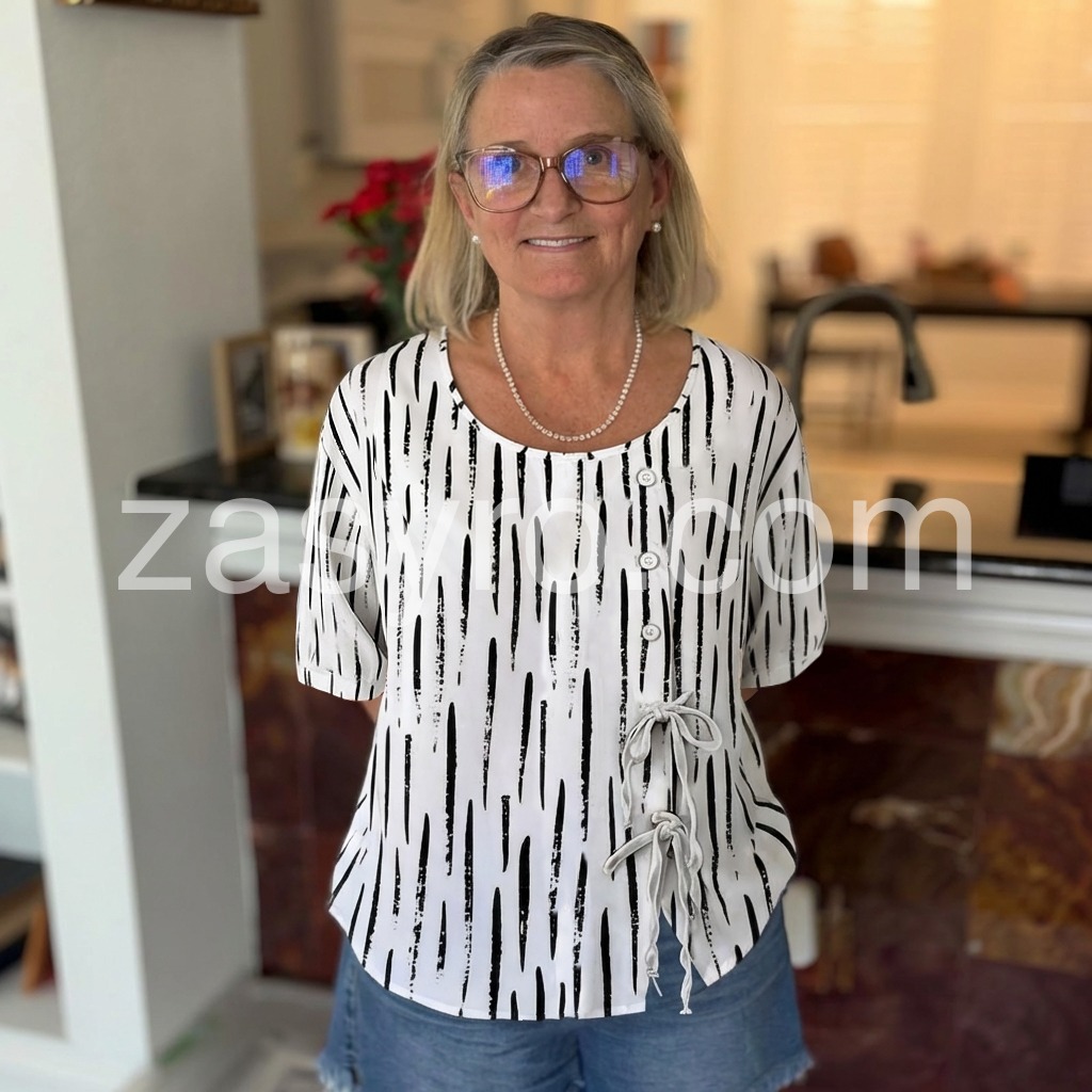 This relaxed-fit blouse features a bold black abstract stripe print on a white base. Round neckline with front button closure and side tie details. Lightweight fabric perfect for everyday wear. Ideal for pairing with jeans or leggings.