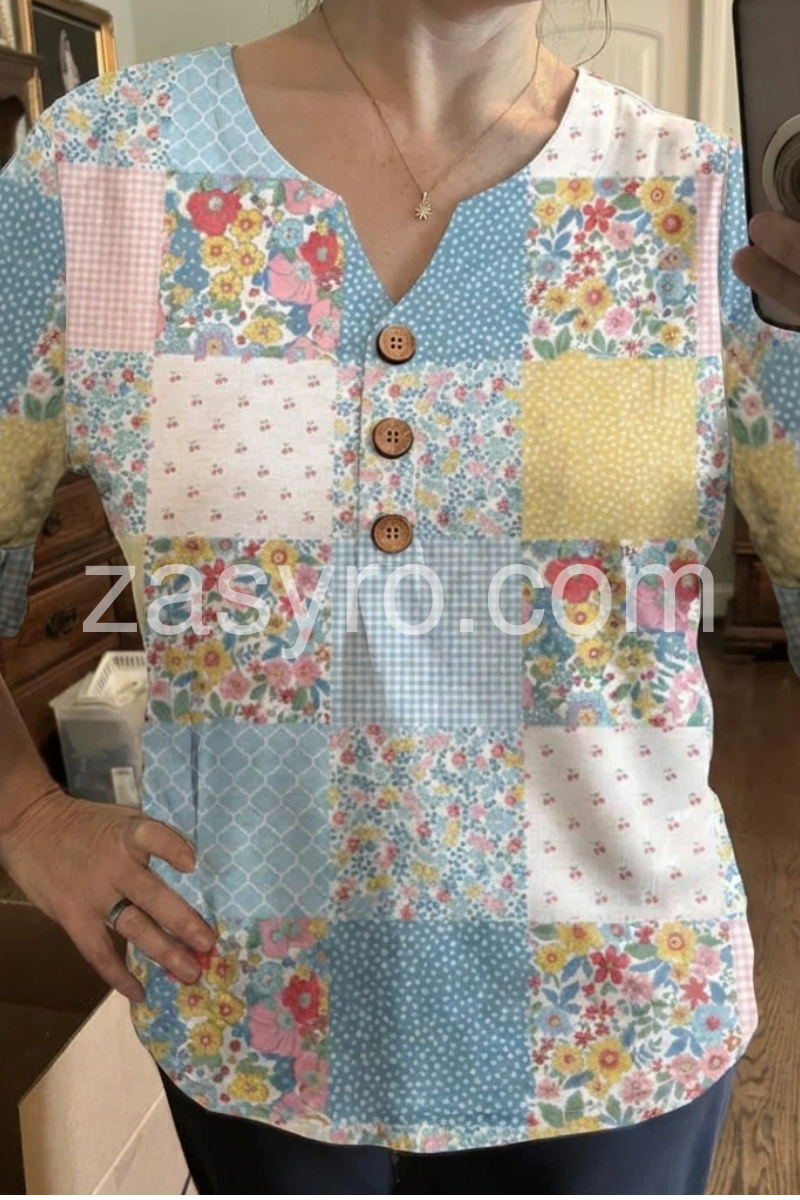 This V-neck top features a colorful patchwork design with floral and gingham patterns. Three-quarter sleeves with ruffled cuffs add a feminine touch. Wooden buttons down the front enhance its rustic charm. Lightweight and perfect for casual wear. Effortlessly cute with a vintage-inspired look.
