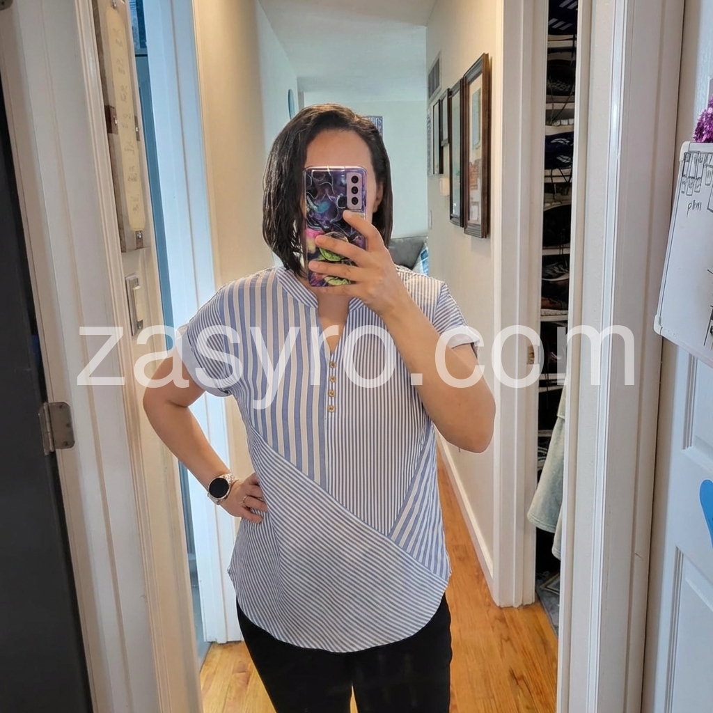 This short-sleeve top features vertical blue and white stripes. V-neckline with front buttons and a stylish wrap design. Cuffed sleeves add a polished touch. Lightweight and perfect for casual wear. Ideal paired with jeans or trousers.