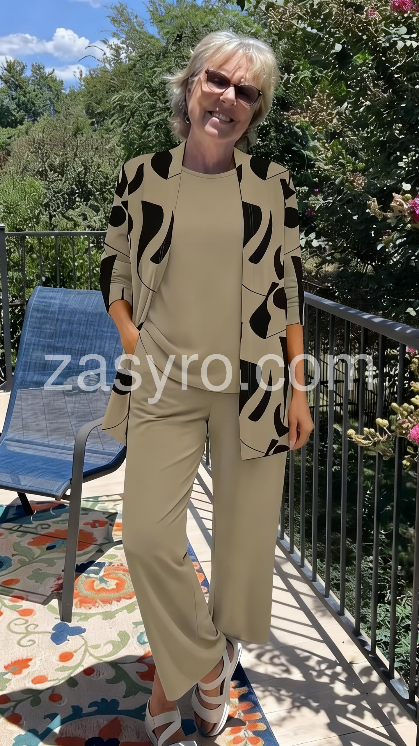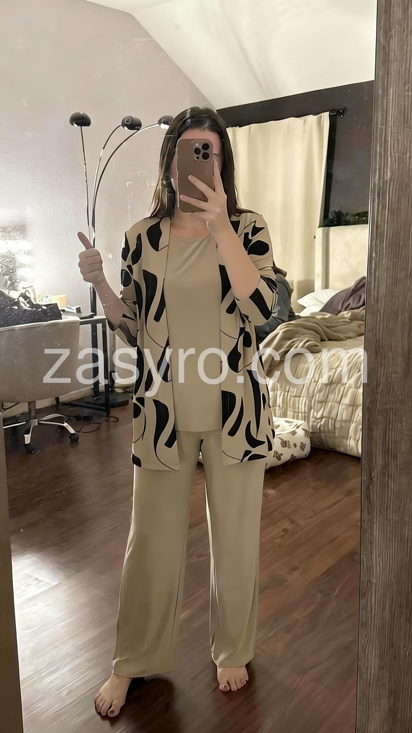 This coordinated set includes a round-neck top, relaxed wide-leg pants, and a matching open-front cardigan in soft brown tones. Made from comfortable, lightweight fabric ideal for everyday wear. The minimalist design offers effortless elegance. Perfect for casual outings or relaxed days at home. Stylish, versatile, and easy to layer.