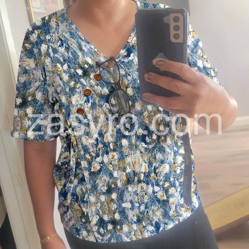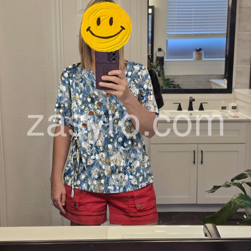 This blouse blends artistic watercolor florals with a flattering wrap silhouette.
