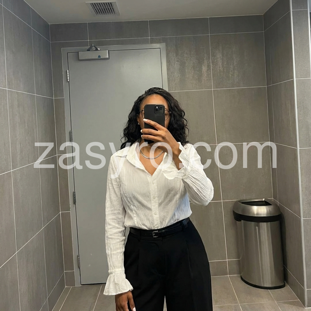 This white plain button-down shirt features a deep V-neck design and flared cuffs for a sophisticated silhouette. Crafted with clean lines and minimal detailing, it offers a versatile, polished look ideal for both professional settings and elegant casual wear. The flared cuffs add a subtle statement, elevating the classic button-down style.