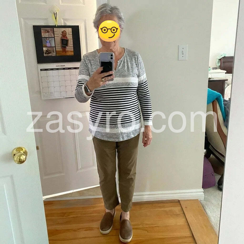 This Youthful Notched Neck Striped Print Long Sleeve Top combines a modern silhouette with timeless style. Designed with a distinctive notched neckline and classic horizontal stripes, it offers a refined yet casual look. The long sleeves provide comfort and versatility, making it a practical choice for layering or standalone wear. Ideal for everyday sophistication, this top complements both relaxed and polished outfits with ease.