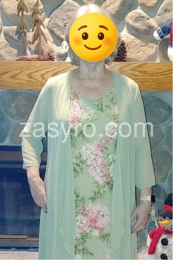 This soft floral dress features a light green base with pink and white blossoms. Paired with a matching sheer duster for a layered look. V-neckline and relaxed fit perfect for warm days. Ideal for garden parties or casual outings. Fresh and feminine style.